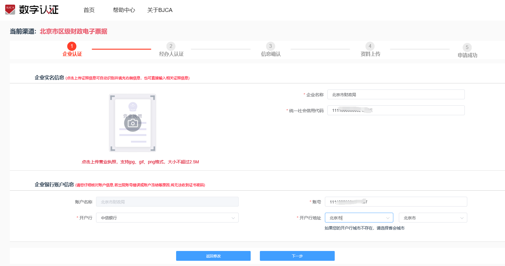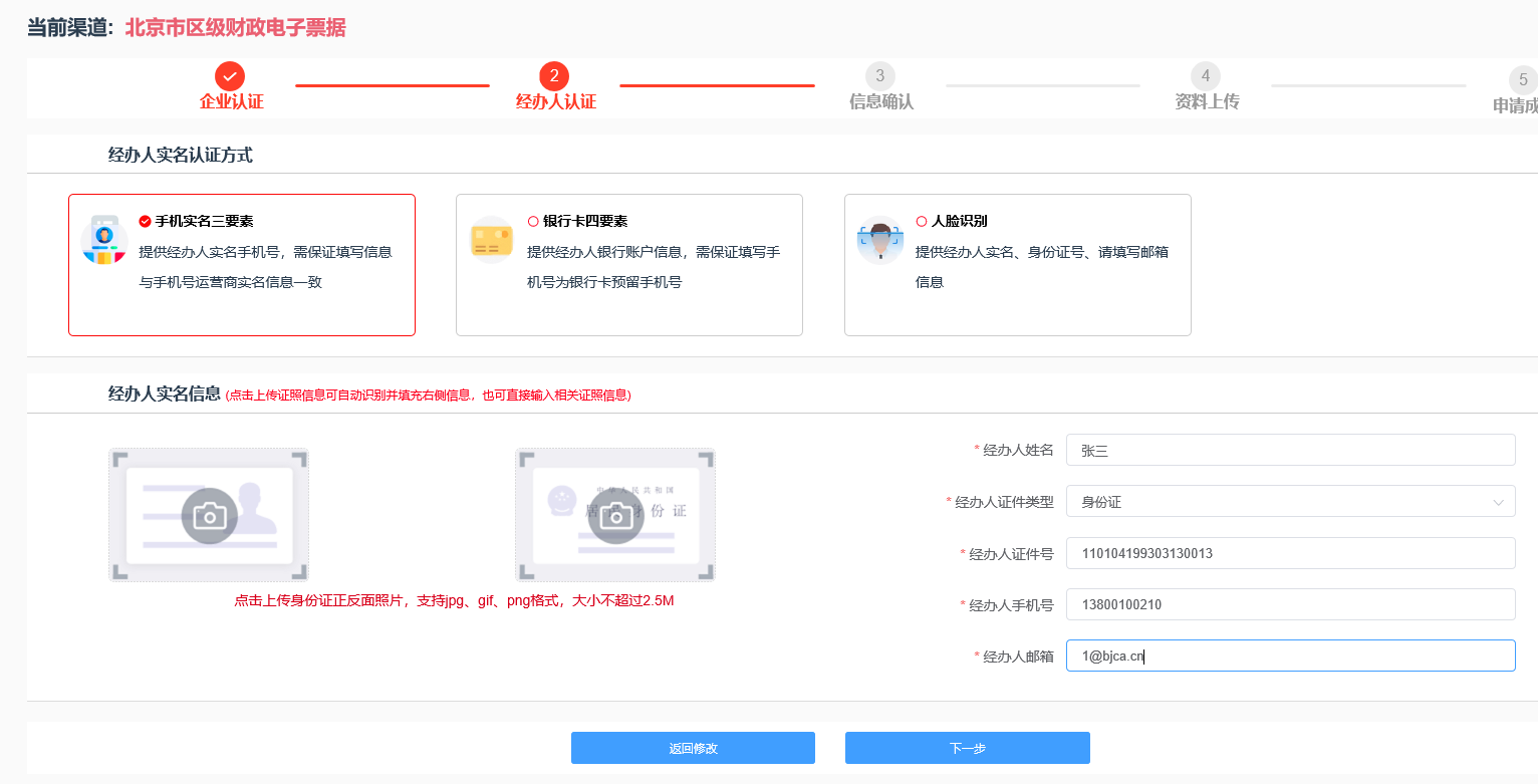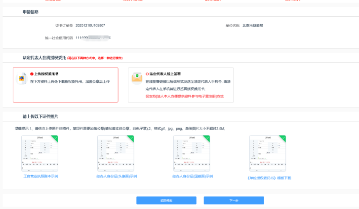 ● 按照温馨提示上传单位证照和经办人身份证件照片、单位授权委托书