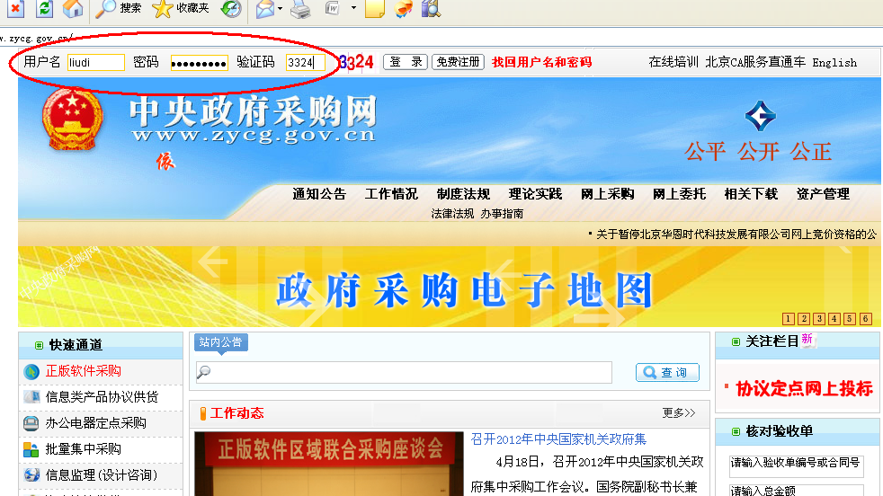 - 中央采购中心用户登录央采网,先使用原用户名口令方式进行登录。