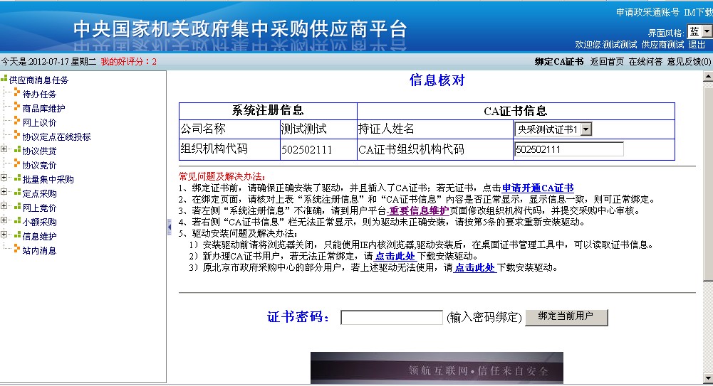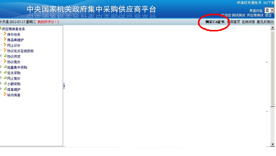 - 证书初次使用时,客户需使用用户名、口令登录中央采购网(http://www.zycg.gov.cn),按照页面提示绑定证书。